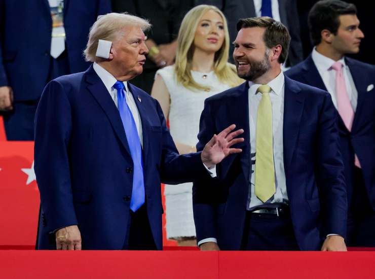 Trump con Vance, il 39enne scelto come vicepresidente in caso di vittoria alle elezioni per la Casa Bianca. Foto Ansa/Epa Allison Dinner