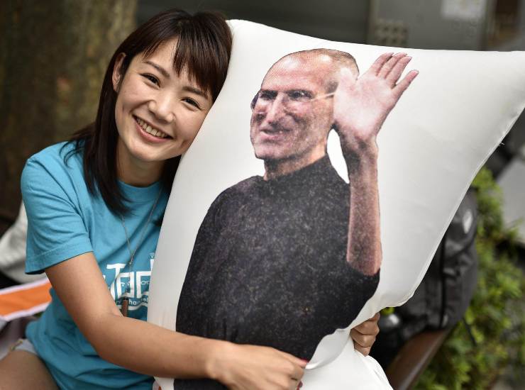 Una fan dell’iPhone con un’immagine di Steve Jobs. Ansa/Epa Franck Robichon