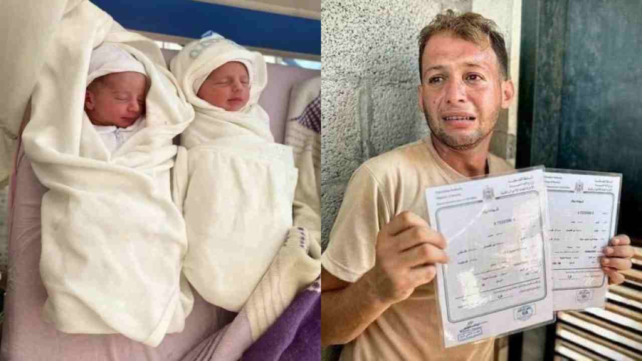 Asser e Ayssel, maschio e femmina, di 4 giorni, uccisi in un raid israeliano a gaza mentre il padre ne registrava la nascita. Foto X @timand2037