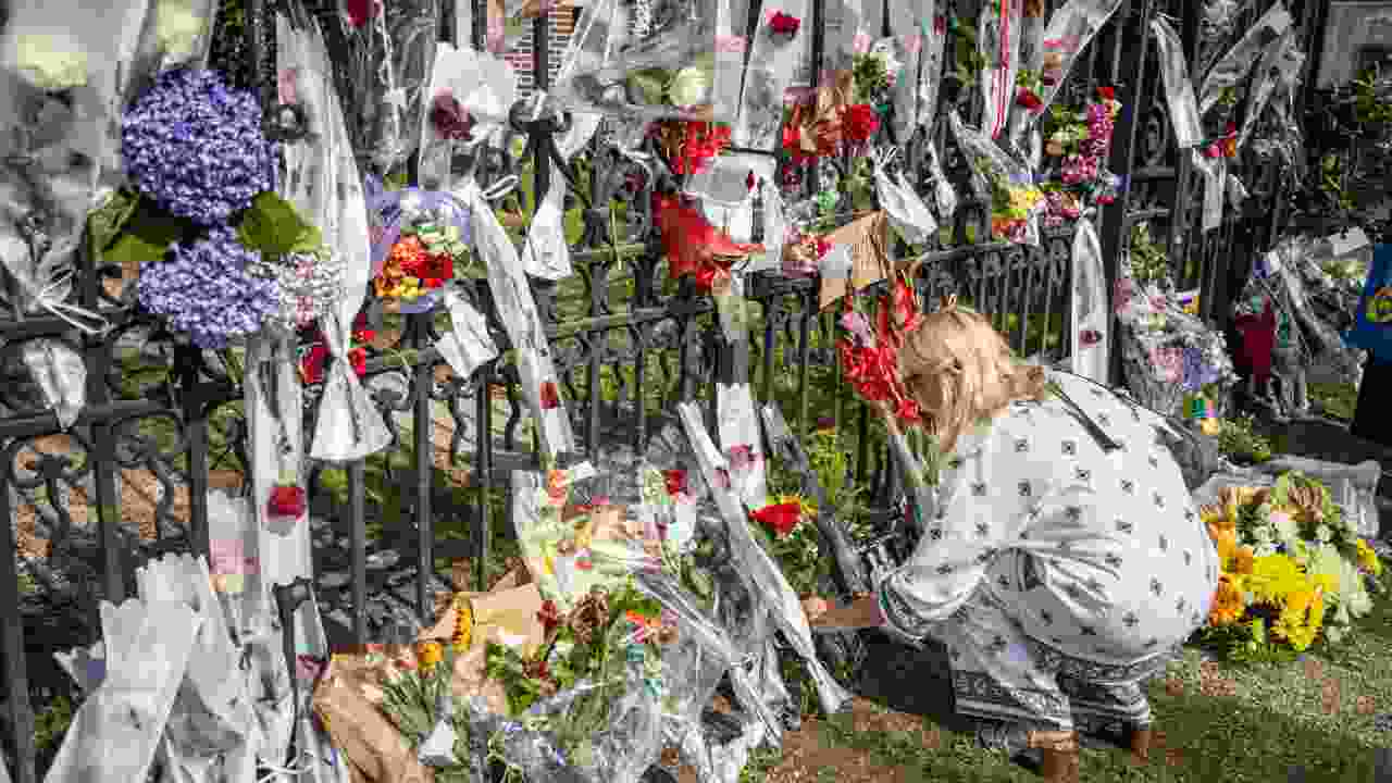 Fiori e omaggi davanti alla villa di Delon nella Loira a Douchy. Foto Ansa/Epa Christophe Petit Tesson