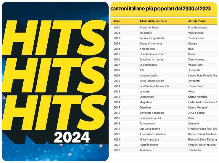 Nel 2000 tra le hit italiane più amate troviamo in pole position la ballad ‘Fuoco nel fuoco’ di Eros Ramazzotti, seguita l’anno successivo dall’indimenticabile brano d’esordio di Valeria Rossi, ‘Tre parole’. ‘Gocce di memoria’ di Giorgia ha invece lasciato il segno nel 2003, con uno dei suoi pezzi più iconici. E come non ricordare “I bambini fanno ooh” di Povia, diventata virale durante il Festival di Sanremo del 2005 o la poetica ‘A te’ del 2008 di Jovanotti. Negli ultimi anni, invece, sembrano riscuotere particolare successo i tormentoni estivi e i featuring.