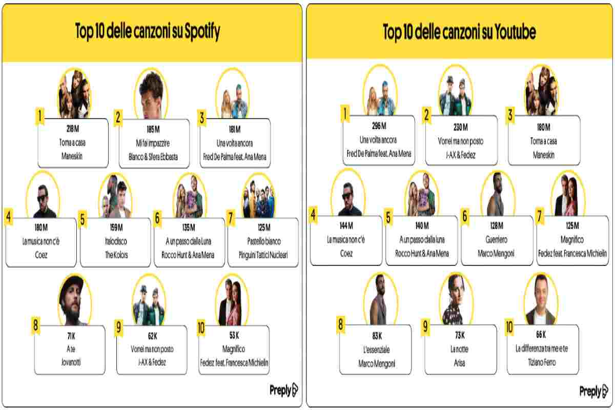 Lo studio ha confrontato le hit italiane più amate e ascoltate anno per anno su Spotify e YouTube, evidenziando alcune differenze tra le due piattaforme. Nella classifica di Spotify la canzone con il maggior numero di stream è ‘Torna a casa’ dei Maneskin con 218 milioni di stream, seguita da ‘Mi fai impazzire’ di Blanco e Sfera Ebbasta (185 milioni). Seguono ‘Una volta ancora’ di Fred De Palma e Ana Mena. Nella classifica di YouTube, invece, si nota un’inversione tra il primo e il terzo posto. ‘Una volta ancora’ occupa la vetta con 296 milioni di visualizzazioni, mentre Torna a casa’ scende in terza posizione con 180 milioni.
